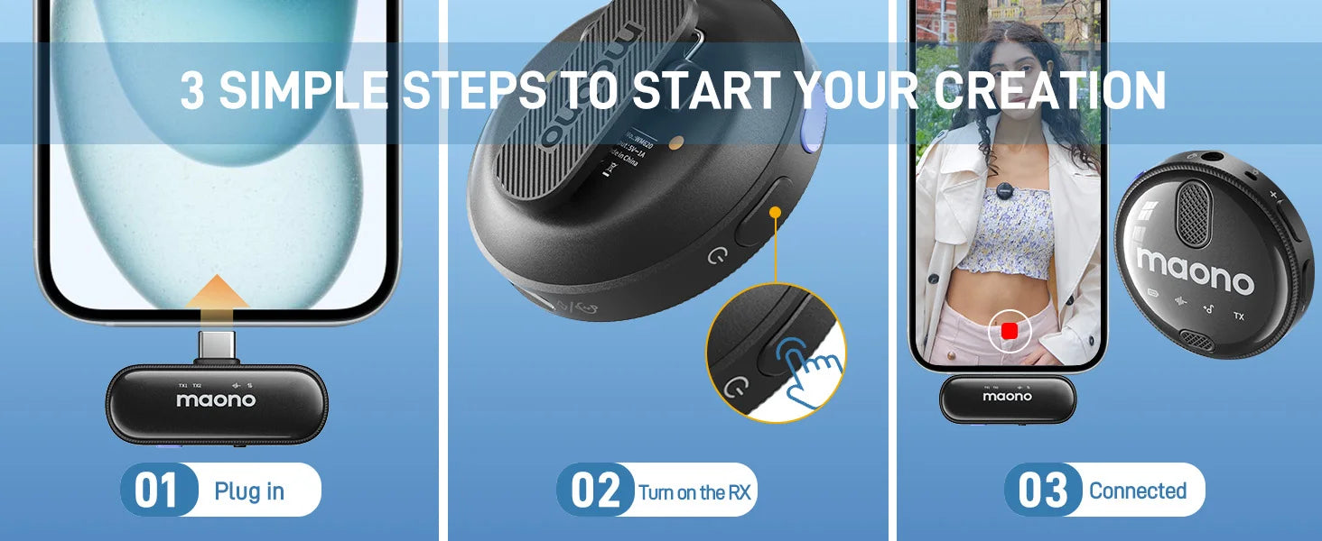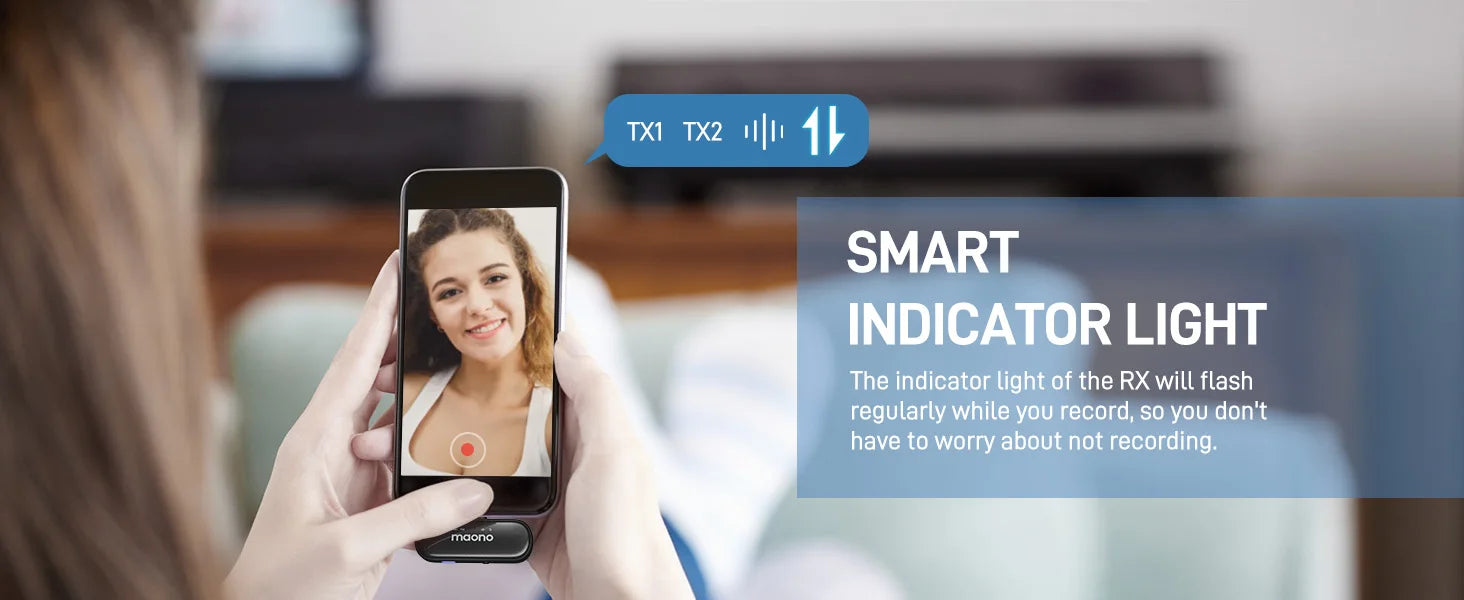 All you need to do is plug the TX into your device and turn on the RX. The RX indicator light will flash regularly during recording, ensuring you don’t have to worry about not recording. This device is compatible with a wide range of devices, including Android phones, iPhone 15 Series, and computers.
