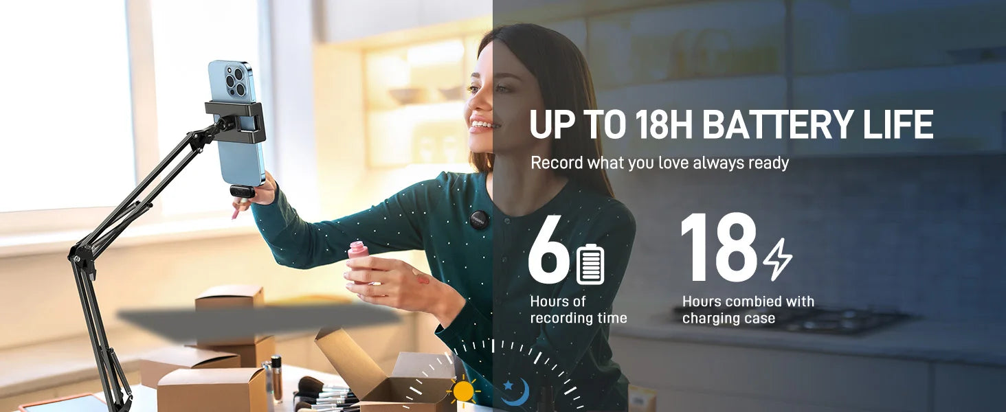 Enjoy uninterrupted recording with our reliable wireless lapel mic. With a battery life of 6 hours and an additional 12 hours of power provided by the charging case, you can record with confidence for extended periods. Plus, the RX interface allows for convenient phone charging while recording.